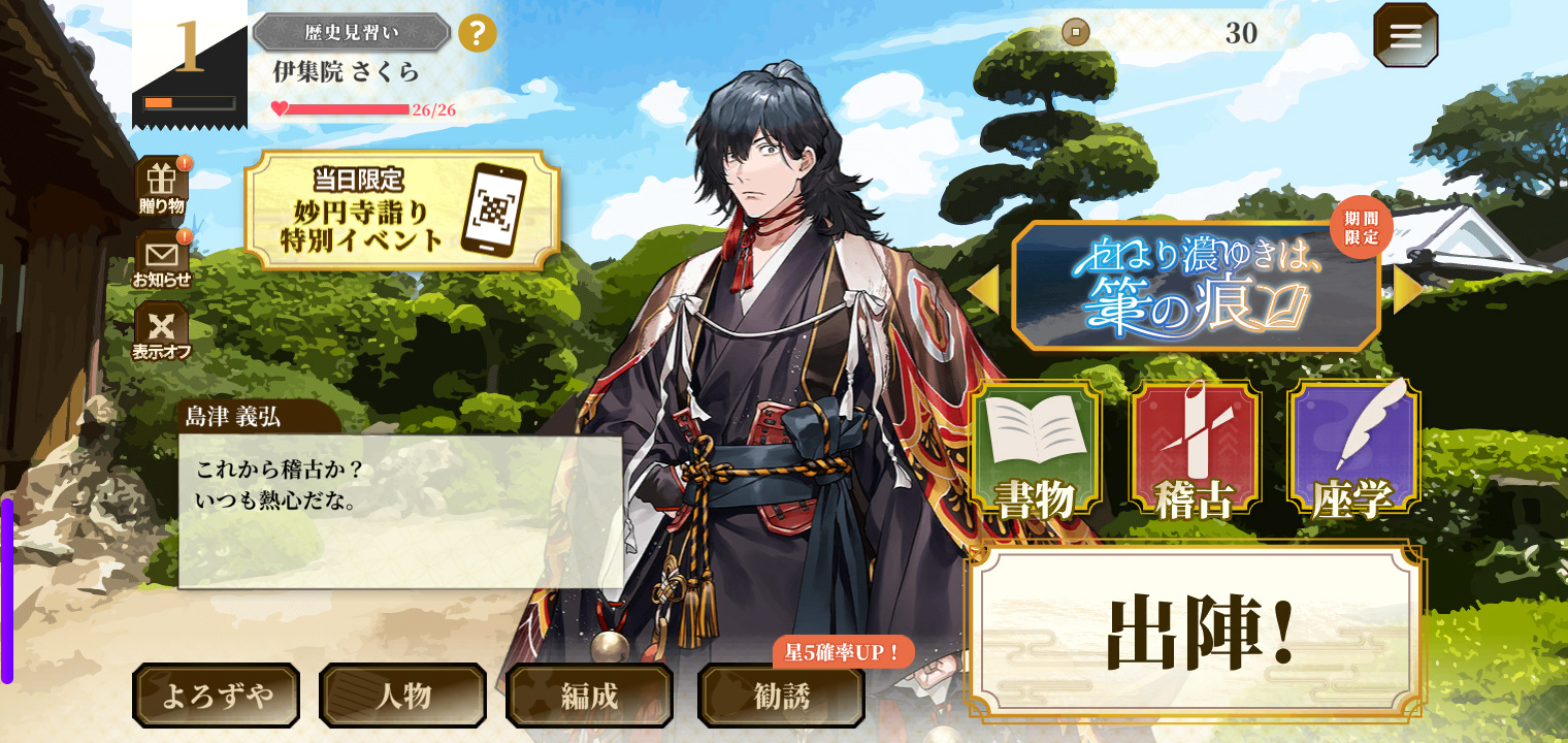 「うたなつ」とは、「うたた往時のなつかしや」の略称で、鹿児島県の妙円寺詣りを題材とした乙女ゲームアプリです。